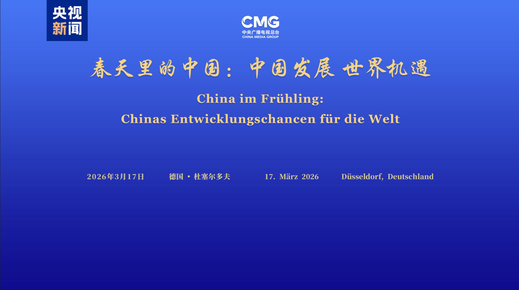 17 березня у Дюссельдорфі — столиці федеральної землі Північний Рейн-Вестфалія — відбувся німецький етап глобального діалогу «Китай навесні: розвиток Китаю — можливості для світу», організований Медіакорпорацією Китаю (CMG) спільно з Генеральним консульством КНР у Дюссельдорфі. Із відеозверненням виступив заступник керівника відділу пропаганди ЦК КПК, генеральний директор CMG Шень Хайсюн.